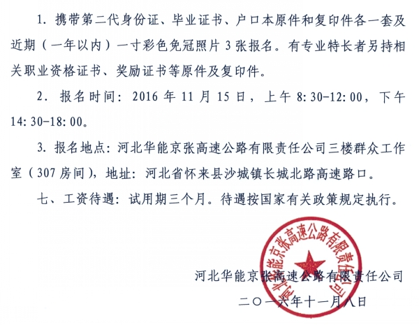 京張高速公司2016年收費(fèi)人員招聘公告